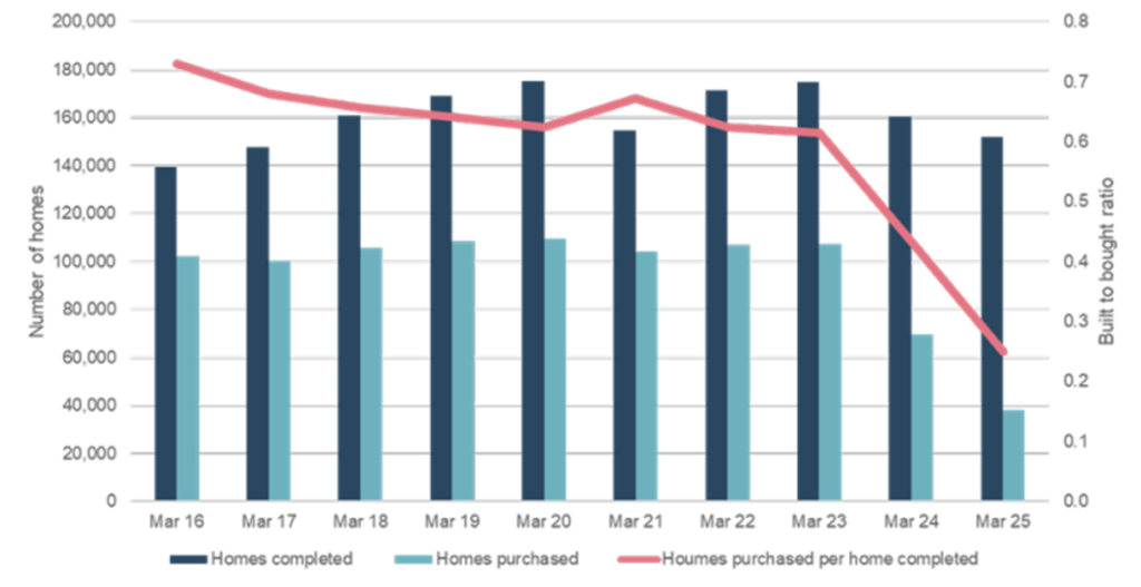 Figure 1 – New build homes completed versus purchased by year ending March 2016-2025